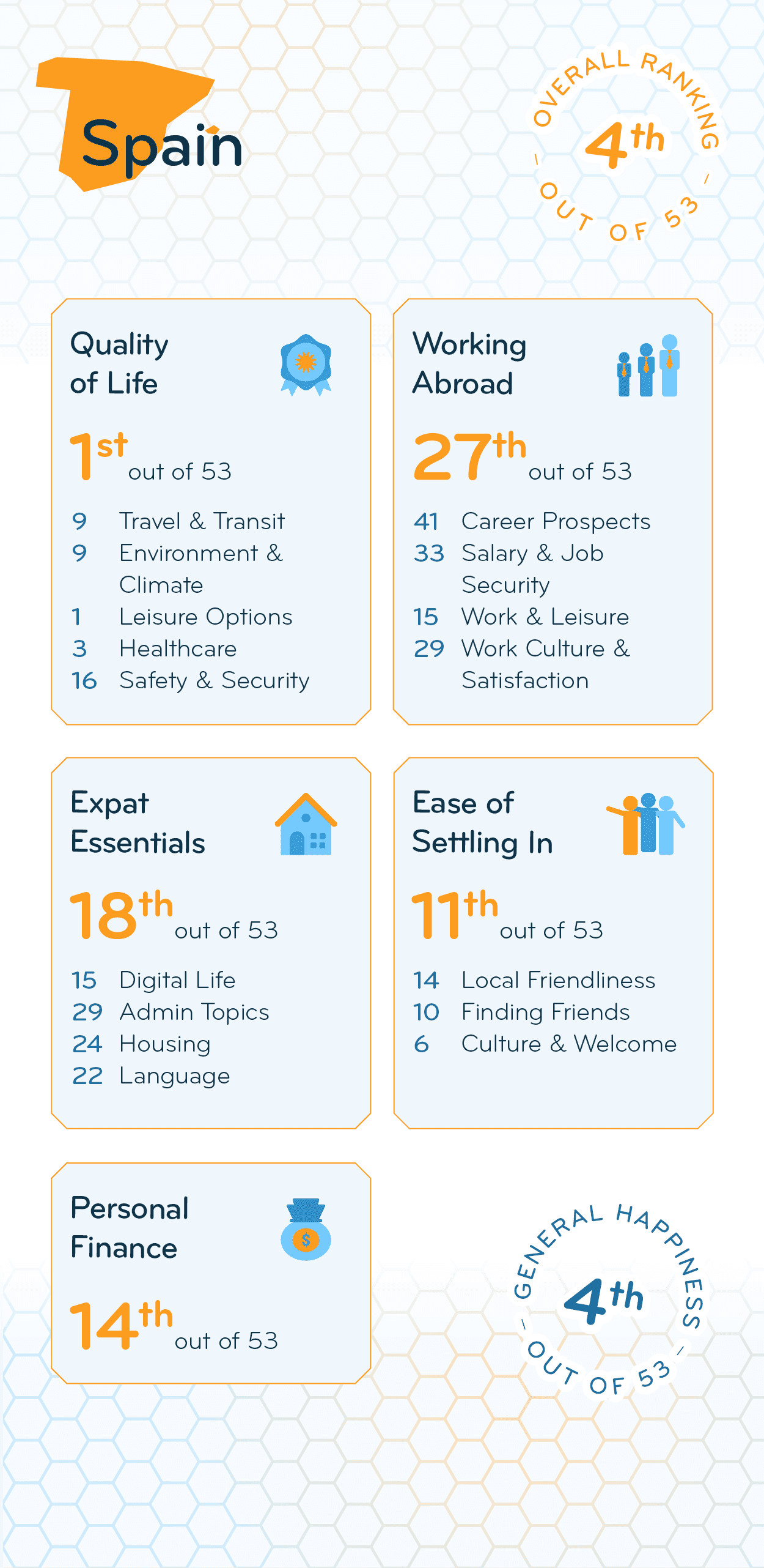Reviews for Working Abroad in Spain are less glowing — the country ranks 27th, its worst result in an index. In the Career Prospects Subcategory, Spain places 41st. Expats are not particularly happy with their career opportunities (36th) or the local job market (41st).