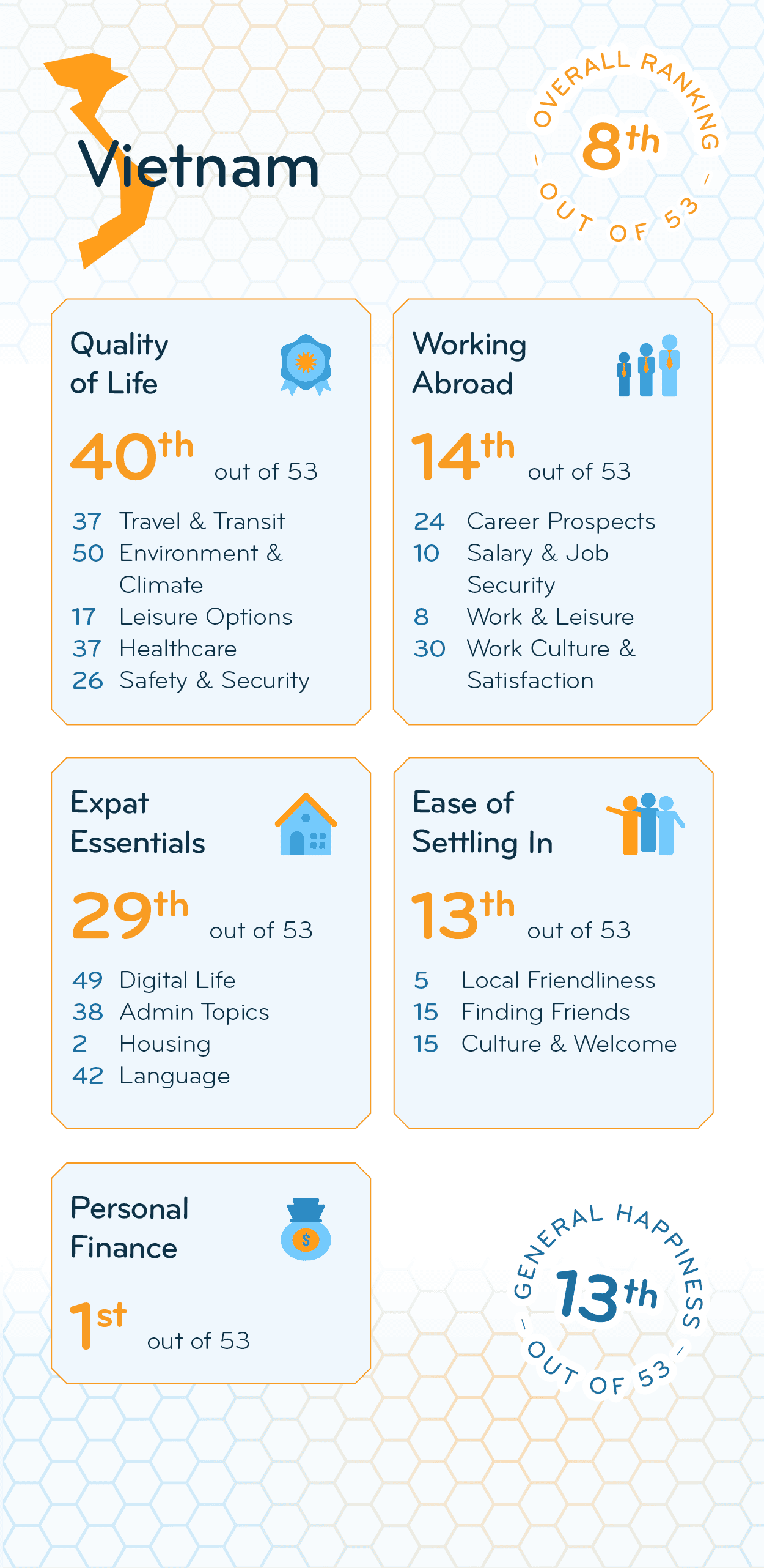 Since last year, Vietnam has improved its rankings across all indices of our survey, placing 8th overall in the Expat Insider 2024 survey. The main reason for the country’s attractiveness as an expat destination can be summarized in one word: finances. And while expats show praise for the Ease of Settling In (13th) and Working Abroad (14th) Indices, they have to adjust to a less-than-stellar Quality of Life (40th). All things considered, expat happiness with their life abroad in Vietnam is ranked 13th worldwide.