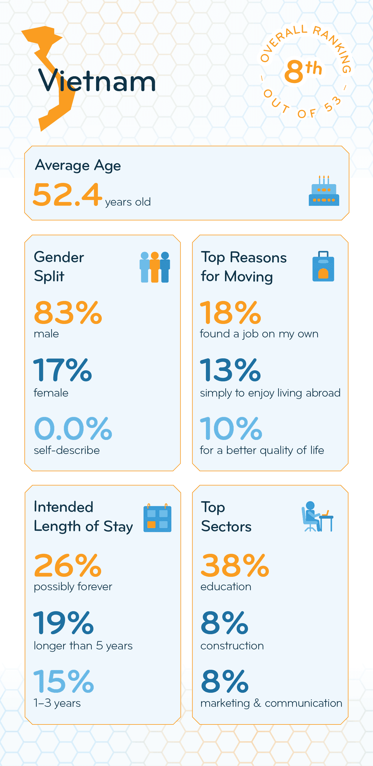 Finances and work are often intertwined, but what’s notable about Vietnam is that less than half of its expat population is working full time (46% vs. 57% globally). About one in five expats (21%) works part time (vs. only 12% globally), and a similar share (18%) is retired (vs. 11%). Still, 38% of expats cite work-related reasons as their primary motivation for coming to the country, which is slightly higher than the global average of 35%.
