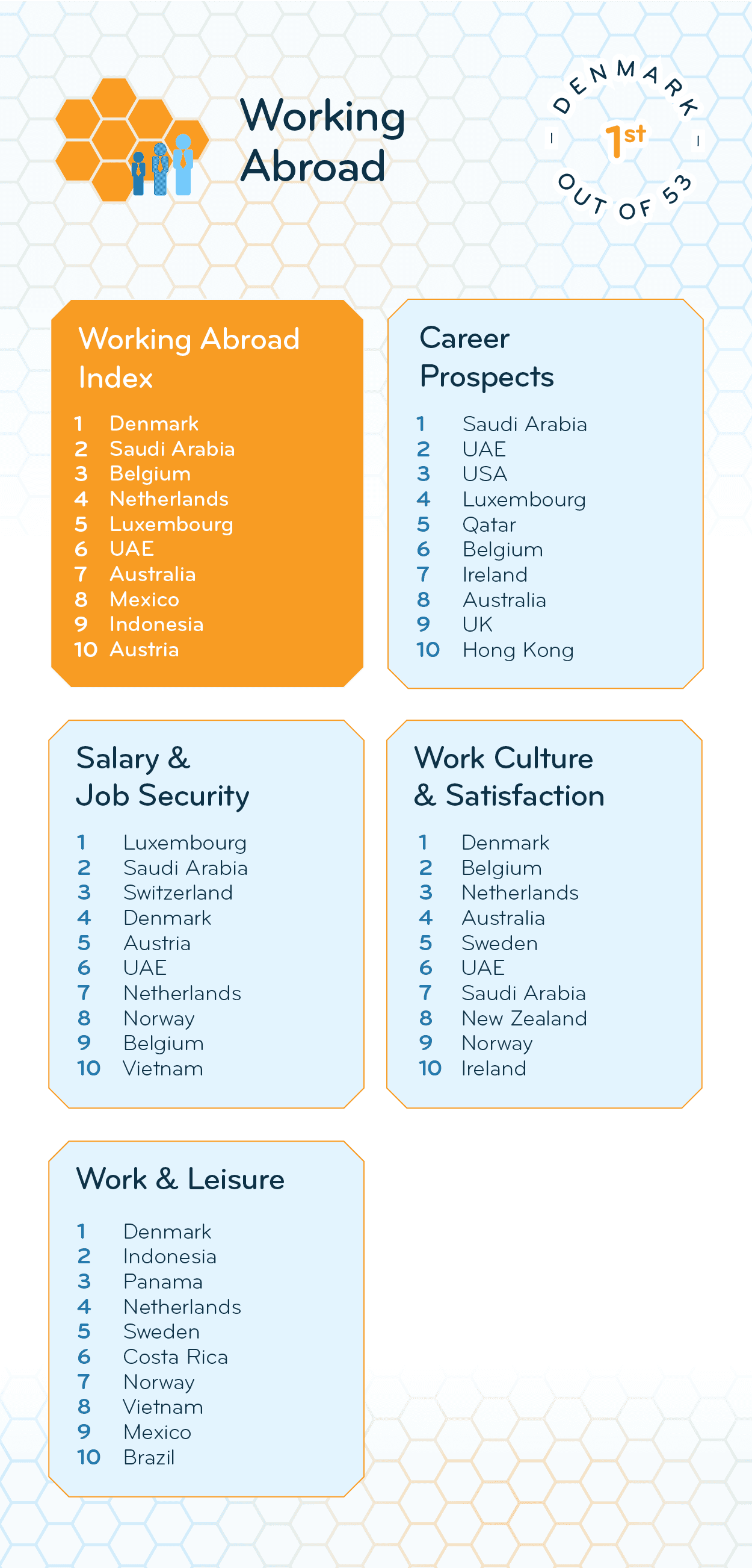 Following an already impressive 6th place in 2023, Denmark has made it to the top of the Working Abroad Index in 2024. The country ranks 1st for two subcategories: Work Culture & Satisfaction and Work & Leisure.