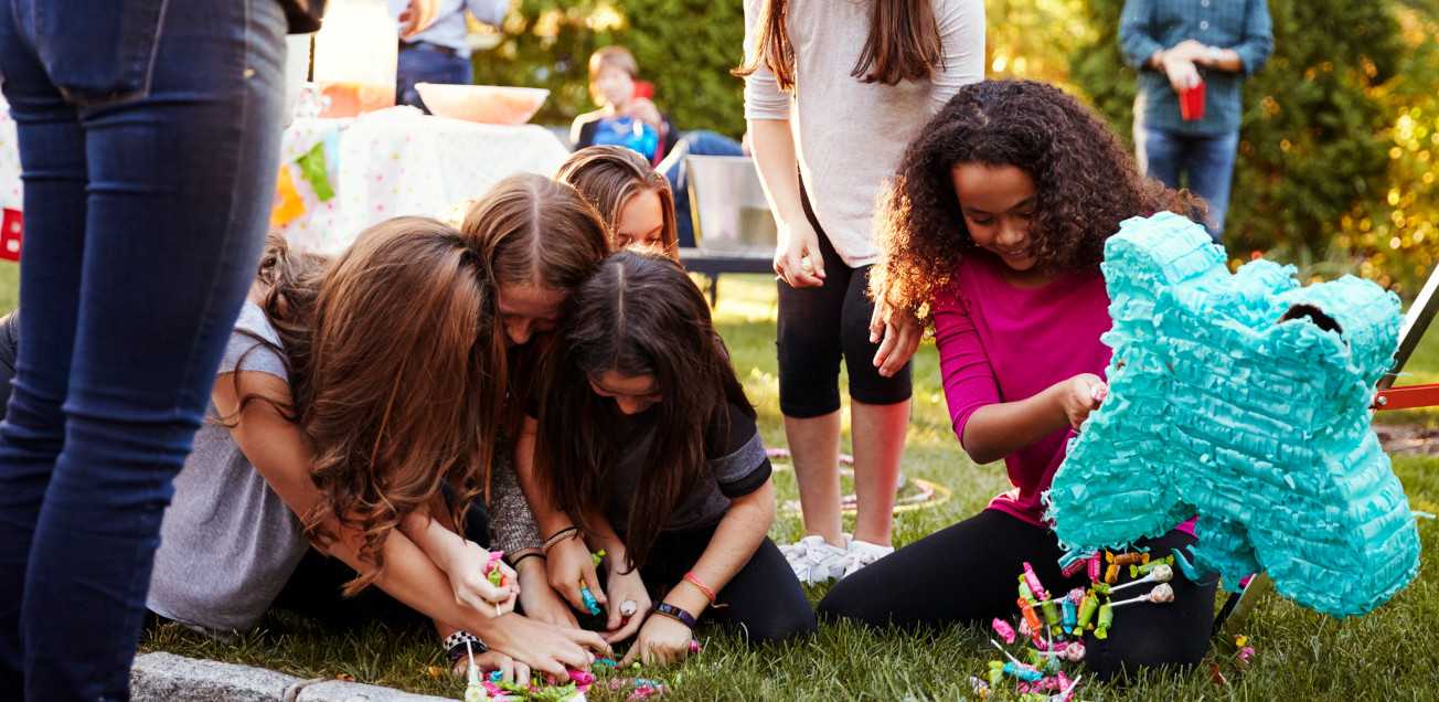 Large Mexican birthday parties are celebrated with a piñata, which is a festive object or an animal made out of papier mâché and crafted in bright colors. The piñata is always filled with candies, treats, and small toys for birthday kids, and party goers take turns trying to break it — while blindfolded — by hitting it with a bat or stick.